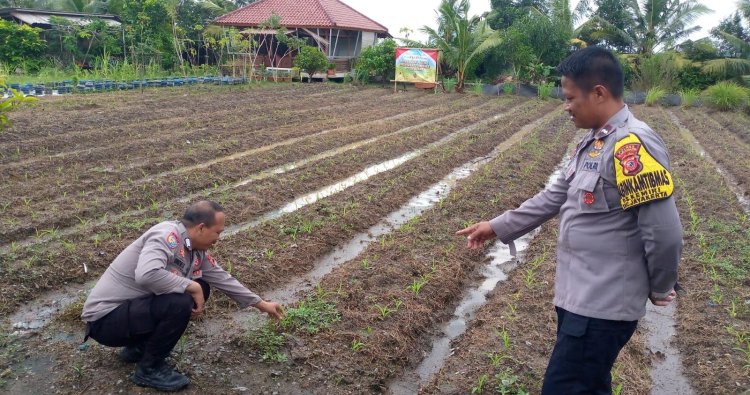 Polres Karawang - Anggota Bhabinkamtibmas Polsek Rengasdengklok Polres Karawang Aipda Ayub Wahyudin S.H bersama Bripka Ghojali Rahman melaksanakan giat Patroli sekaligus pengecekan tanaman jagung Hybrida yang berumur 11 hari di lahan garapan milik Ponpes Nurussalan di Dusun Babakan RT.008/003 Desa Medangasem Kec.Jayakerta Kab.Karawang, Senin, (09/02/2026)