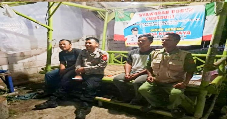 Dalam kegiatan Sambang silaturahmi yang berlangsung di dusun Bedeng RT 005/002 Bhabinkamtibmas Desa Kurajaya Kec.Kutawaluya Kab.Karawang Bripka Ruswandi memberikan arahan dan himbauan kamtibmas kepada petugas piket anggota Linmas,