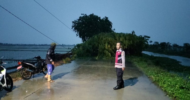 Berdasarkan laporan dari personil dan masyarakat bahwa telah terjadi peristiwa pohon tumbang akibat cuaca buruk di jalan raya layapan kec. Tempuran, Kapolsek Tempuran Akp Gulipar, SH. Memerintahkan personil agar segera mengevaluasi dan mengamankan area kejadian pohon tumbang tersebut.