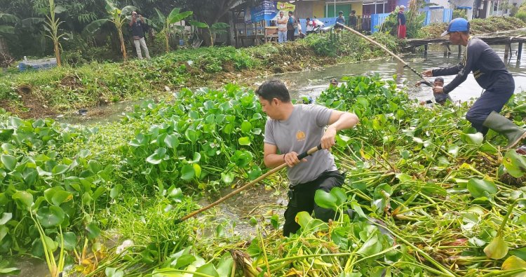 Kapolsek Tirtajaya bersama masyarakat bergotong royong membersihkan Sungai Irigasi, Kapolsek Tirtajaya Iptu Ari Lesmono menuturkan Bahwa, sampah dan rumput serta eceng gondok yang sudah tinggi harus dibersihkan agar bersih dan mengalir Airnya untuk Petani.