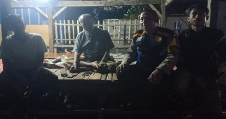 Tingkatkan Kondusifitas di lingkungan desa binaannya Połsek Cikampek melalui Bhabinkamtibmas Desa Tirtasari Aiptu Tarjono sambang Pos Ronda sekaligus bersama Satkamling yang sedang melaksanakan piket ronda malam.