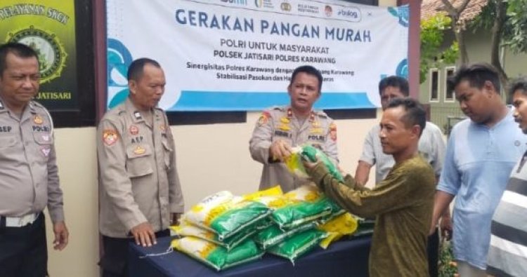 Polres Karawang - Polsek Jatisari, Polres Karawang, menggelar Gerakan Pangan Murah dengan menyediakan beras bulog murah yang dikemas dalam kemasan 5 kilogram. Kegiatan berlangsung di Mako Połsek Jatisari, Desa Balonggandu, Kec Jatisari, Kab Karawang pada Ju'mat (17/10/2025).